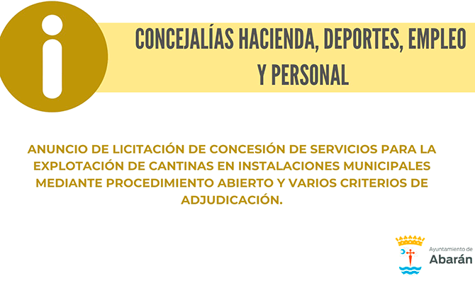 Las Concejalías de Hacienda, Deportes, Empleo y Personal del Ayuntamiento de Abarán informan del Anuncio de licitación de concesión de servicios para la explotación de cantinas / quioscos en instalaciones municipales mediante procedimiento abierto y con varios criterios de adjudicación.