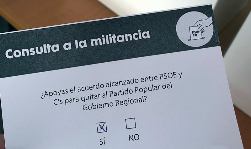 Por otra parte, la ejecutiva regional del PSRM-PSOE ha detallado que el 99% de la militancia votó este domingo a favor del acuerdo de gobierno alcanzado entre los socialistas y Ciudadanos para tratar de desbancar al PP del poder, según informó el secretario de Organización del PSRM, Jordi Arce.