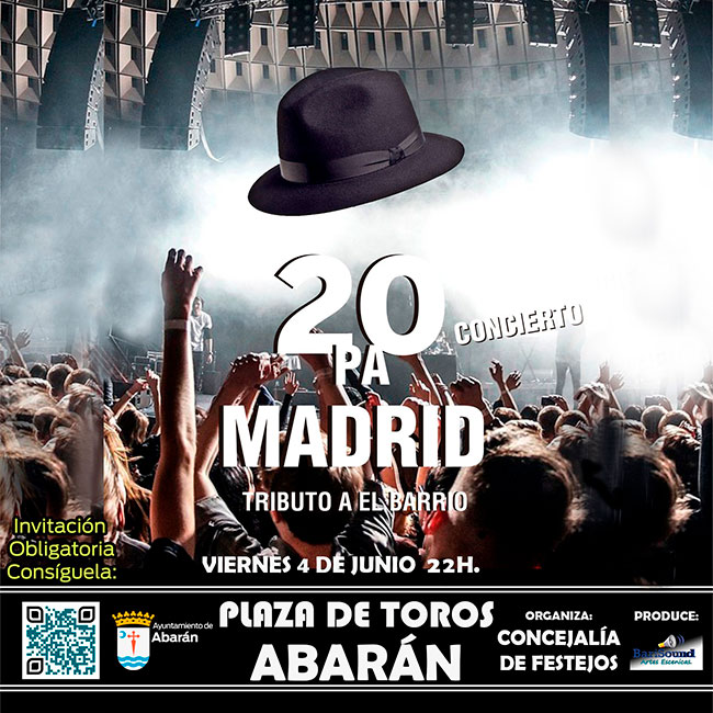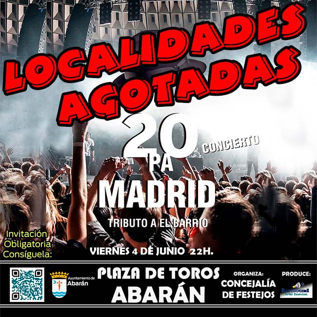 La Concejalía de Festejos del Ayuntamiento de Abarán ha programado para el próximo 4 de junio (viernes), a las 22:00 horas y con entrada gratuita (con invitación y aforo limitado), el espectáculo ‘20 pa Madrid Concierto Tributo a El Barrio’.