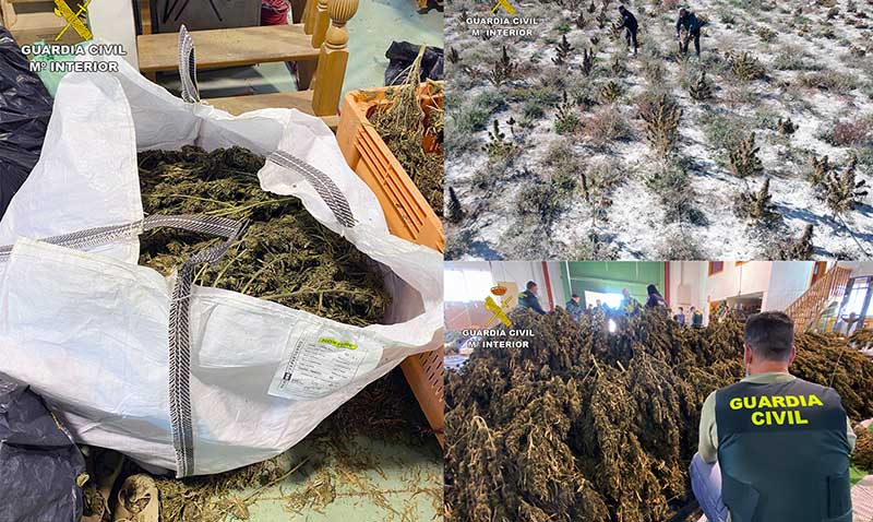En colaboración con la Policía Local de Blanca, la Guardia Civil llevó a cabo sendos registros que se saldaron con la incautación de 4.779 plantas de cannabis sativa -más de mil de ellas en cogollos- material para su cultivo y distribución, así como documentación relacionada con la trama delictiva desmantelada.