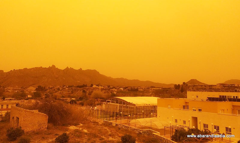 El fenómeno meteorológico conocido como 'Calima' -que se produce debido a unas determinadas partículas en suspensión en la atmósfera-, tiñe esta tarde de un intenso color amarillo-anaranjado los cielos de la Región de Murcia una situación que, en caso de venir acompañada de precipitaciones suele producir lo que venimos a llamar 'lluvia de barro'.