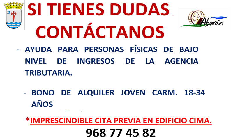 Desde el área de Servicios Sociales del Ayuntamiento de Abarán se ha puesto a disposición de los ciudadanos del municipio un punto de información sobre los requisitos y forma de tramitación de las ayudas de 200 euros para personas físicas de bajo nivel de ingresos y patrimonio del Ministerio de Hacienda, y del Bono Joven de Alquiler de la Comunidad Autónoma de la Región de Murcia.