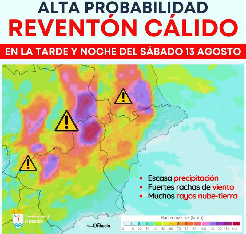 El Ayuntamiento de Abarán, a través de la información elaborada por el servicio meteorológico MeteOrihuela, emitió un comunicado en el que advertía de la «alta probabilidad de reventón cálido en Abarán en la tarde y noche del sábado, 13 de agosto, debido al ascenso de temperaturas», por lo que se rogaba a la ciudadanía que extremase las precauciones.