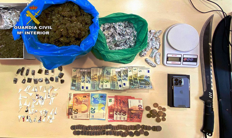 En uno de los inmuebles, la Benemérita se incautó de 129 envoltorios de marihuana, 48 dosis de cocaína, 18 porciones de hachís, un machete, dinero, terminales de telefonía móvil, básculas de precisión, libretas con anotaciones de las supuestas ventas y útiles para la dosificación y distribución de las sustancias.