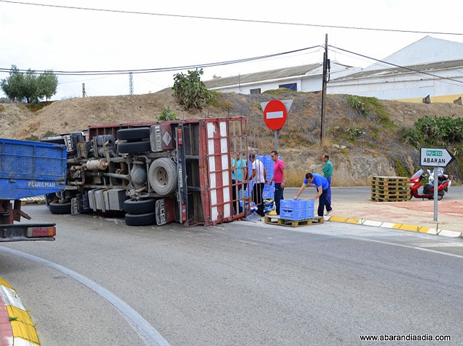 Un camión, que se dirigía a las instalaciones de Frutas Esther, volcó a primera hora de la tarde de este martes -sin que se produjeran heridos- en la rotonda de acceso a la citada empresa. La carga, una pequeña parte de la cual quedó esparcida por la calzada, fue retirada rápidamente por trabajadores de la citada mercantil, logrando así que el tráfico por la zona apenas se viera afectado.