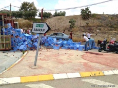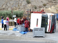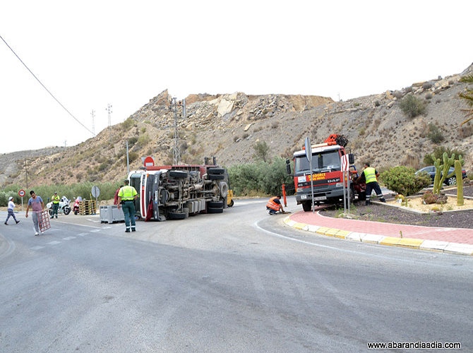 El suceso ocurría pocos minutos antes de las 15:00 horas. El camión, que regresaba de recoger una partida de chatos recolectada esa misma mañana, volcaba cuando ya prácticamente había completado la rotonda, aunque, por fortuna, su conductor -único ocupante- no resultó herido.