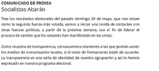 «Todos los que el 24-M conformábamos el equipo de apoderados y simpatizantes de nuestro Partido no hemos podido estar más satisfechos con los resultados obtenidos en nuestro municipio: 423 votos, lo que significa que, si tenemos en cuenta las últimas elecciones, las europeas, en las que obtuvimos el apoyo de 167 electores, se ha producido un aumento de 256 votos, lo que supone multiplicar nuestro resultado anterior por 2,5, algo que entendemos como un crecimiento de la voluntad de cambio dentro de nuestro pueblo. Pero nosotros no queremos conformarnos con estos resultados, porque  nuestra intención no es otra que seguir creciendo», se puede leer en la nota de prensa.