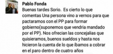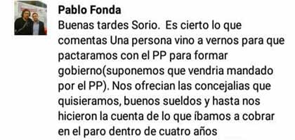 El mensaje de Pablo J. Rodríguez a través de Facebook viene en respuesta a un comentario anterior de otro usuario de la referida red social en el que éste afirmaba haber oído un rumor en el sentido de que «un empresario local quiere conseguir lo que no han logrado las urnas, ofreciendo un sueldo a tres concejales de la oposición de 1.500 euros al mes durante los próximos cuatro años. Sé que esos tres concejales y su grupo tienen mucho más respeto por la democracia, por su trabajo, esfuerzo y dedicación y por la gente que los apoya, y que por eso sé que nunca aceptarían una cosa así. Pero si esta información es cierta y no es un rumor pueblerino, deberían hacerla pública de alguna forma (comunicado, rueda de prensa, etc.), denunciarlo ante el pueblo, si queremos que cambie algo».