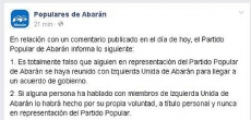 Izquierda Unida - Abarán ha destapado ‘la caja de los truenos’ a través de un mensaje publicado en la red social Facebook por uno de sus dirigentes, Pablo J. Rodríguez, cabeza de lista en las municipales del 24-M. En su escrito, el militante de la citada formación política desvela que «Una persona vino a vernos para que pactáramos con el PP para formar gobierno. Nos ofrecían las concejalías que quisiéramos y buenos sueldos», asegura, añadiendo además que «esto no lo habíamos hecho público por qué no hay ningún documento que lo diga, ni grafico ni por escrito ni grabación».