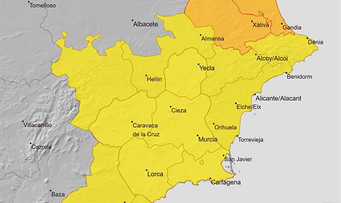 La Agencia Estatal de Meteorología (Aemet) advierte de que hoy pueden ocurrir precipitaciones de lluvia de hasta 25 litros por metro cuadrado en una hora en toda la Región de Murcia. Por ello, emite aviso por fenómenos meteorológicos adversos de nivel amarillo por lluvia y tormentas.