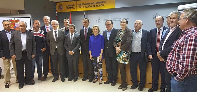 La consejera Adela Martínez-Cachá, y el subsecretario Jaime Haddad, acompañados por el Delegado del Gobierno, Antonio Sánchez-Solís, presentaron estas mejoras al sector en una reunión mantenida en la Delegación del Gobierno, y a la que también asistieron el director general de Producciones y Mercados Agroalimentarios, Fulgencio Pérez, y los miembros de la Comisión Territorial de Seguros Agrarios, entre otros interlocutores.