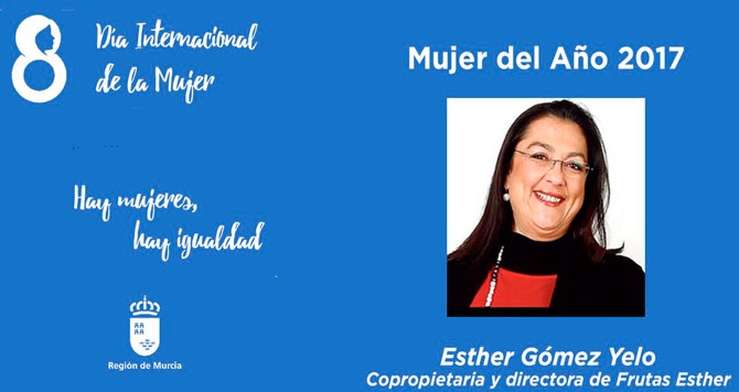 Esther Gómez Yelo, copropietaria y directora de Frutas Esther de Abarán ha sido elegida Mujer del Año 2017. El jurado resaltó su labor como empresaria hortofrutícola que exporta productos de la Región a mercados internacionales. «Es un ejemplo de empoderamiento de las mujeres y la demostración de su capacidad, inteligencia y tesón».