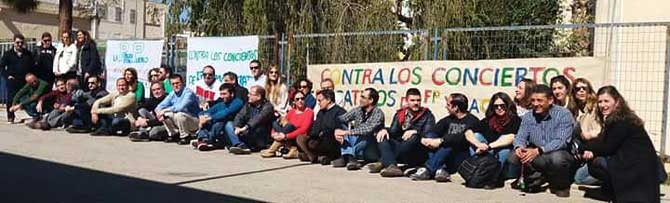 Un grupo de profesores del Instituto de Educación Secundaria 'Villa de Abarán', al igual que hicieron otros educadores de la práctica totalidad de municipios de toda la Región, se manifestaron este miércoles a mediodía como medida de protesta por el cambio en la normativa regional que permitirá a los centros privados concertar los estudios hasta el Bachillerato y la Formación Profesional.
