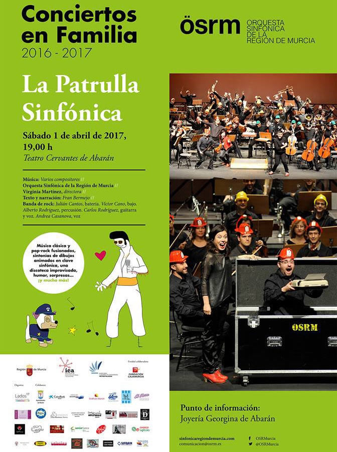 La Asociación Cultural ‘17 Lados’ ha programado para el sábado 1 de abril (19:00 horas en el teatro Cervantes), la actuación de la Orquesta Sinfónica de la Región de Murcia (OSRM), con su espectáculo familiar ‘La patrulla sinfónica’, una producción musical que ha obtenido grandes elogios en los ‘Conciertos en Familia’ celebrados esta temporada en el Auditorio ‘Víctor Villegas’ de Murcia.