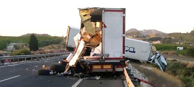 El conductor de un camión resultó herido grave como consecuencia de un aparatoso accidente de tráfico ocurrido este miércoles de madrugada en Cieza, en la autovía A-30 sentido Murcia, una situación que originó la activación del nivel rojo en ese punto (en el kilómetro 102.1), lo que significó que la circulación estuvo cortada al tráfico hasta que se retiraron los vehículos accidentados y se limpió la calzada.