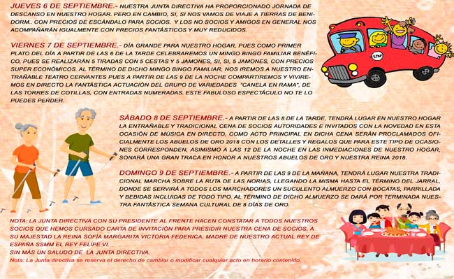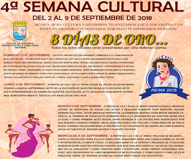 La Junta Directiva del Hogar del Pensionista de Abarán está desarrollando en estos días la programación de su cuarta semana cultural que, bajo la denominación de '8 días de oro', incluye una serie de actividades donde cultura, música, ocio y diversión se dan la mano del 2 al 9 de septiembre.