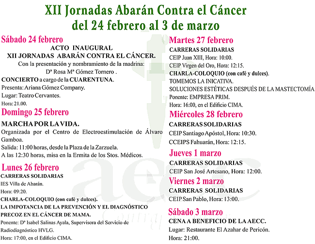 Para mañana lunes día 26 está previsto el inicio de las 'carreras solidarias' en las que participarán los alumnos de los colegios de Abarán. Y también el lunes, a las 17:00 horas, habrá una charla-coloquio sobre 'La importancia de la prevención y el diagnóstico precoz en el cáncer de mama', a cargo de Isabel Salinas, supervisora del servicio de diagnóstico del Hospital de la Vega 'Lorenzo Guirao' de Cieza.