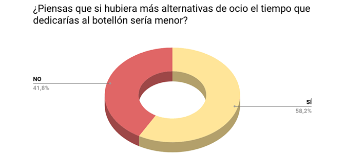 Como conclusión, la mayoría de los encuestados piensan que con más opciones de ocio sus fines de semana serían más saludables. «Como sugerencia, y sin basarnos en datos objetivos sino en nuestra propia experiencia personal, cuando se organice alguna actividad, tengan en cuenta que no disponemos de gran cantidad de dinero para el fin de semana, por lo que si se organizan actividades con coste económico elevado (20€ es mucho para nosotras y nosotros), seguramente no podemos asistir», argumentan los jóvenes que han llevado a cabo la encuesta.