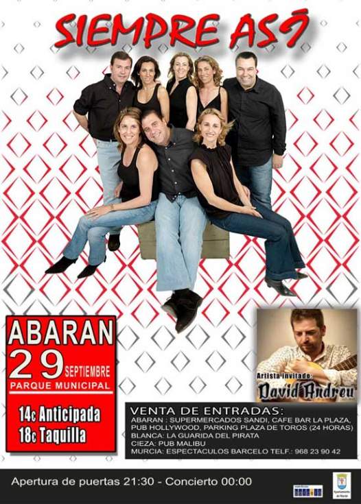 El grupo andaluz 'Siempre así', autores de temas tan conocidos como 'A mi manera' o 'Si los hombres han llegado hasta la luna', traerá hoy hasta Abarán uno de los conciertos “GIRA 25 LA FIESTA DE SIEMPRE ASÍ", un espectáculo musical que se podrá disfrutar en el parque municipal, donde estará como artista invitado David Andreu.