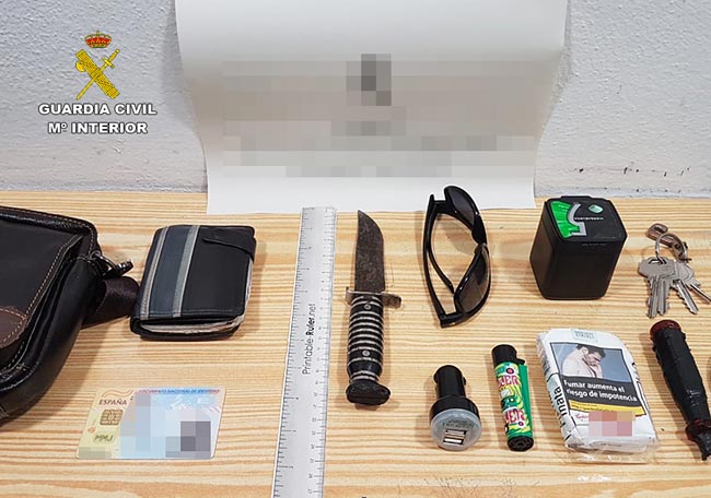 Una vez identificado se comprobó que se trataba de un experimentado delincuente, con antecedentes por delitos similares, por lo que se procedió al examen de sus pertenencias entre las que portaba un punzón, un arma blanca y varios cogollos de marihuana, así como documentación y pertenencias sustraídas del interior de dos vehículos que habían sido violentados en la zona, todo lo cual resultó incautado.