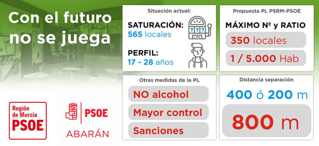 Esta saturación se debe fundamentalmente a que la ley permite la apertura de locales, salvando una distancia mínima de tan solo 200 metros de separación, cuando se trata de locales específicos de apuestas. Esto explica la proliferación de este tipo de establecimientos, que no generan empleo en la misma proporción de los ingresos que representan para sus propietarios. Por esta razón, la propuesta del PSRM-PSOE propone que la distancia se incremente hasta los 800 metros, que habrán de cumplir con respecto a otros locales similares y a colegios, centros educativos, culturales y sociales».