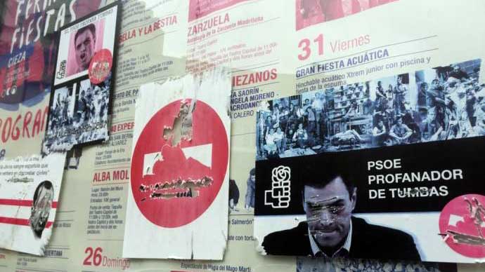 Con frases como 'El Valle no se toca' y 'PSOE profanador de tumbas' en un ataque directo al presidente del Gobierno, Pedro Sánchez, varios puntos de Cieza han aparecido esta mañana adornados con pegatinas en contra de la exhumación de Franco del Valle de los Caídos. Estas consignas han sido pegadas en algunos tablones de anuncios y mupis de la localidad.