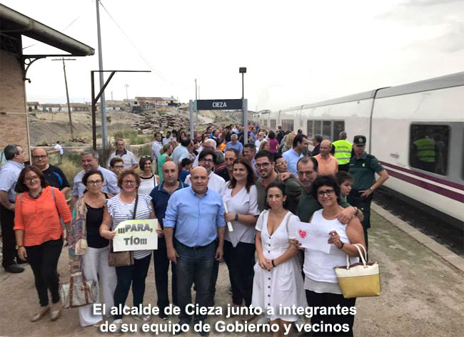 Unas 200 personas se concentraron este lunes por la tarde en la Estación del Ferrocarril en Cieza -al igual que ocurría en la de Hellín-, para reivindicar que el nuevo tren híbrido que desde esta semana hace el recorrido entre Cartagena y Madrid, tenga parada en estas dos ciudades. Entre los concentrados se encontraban los alcaldes de Abarán y Cieza, José Miguel Manzanares -además de las concejalas Mónica Honrubia y Alba Gómez (PP)-, y Pascual Lucas (PSOE), junto a integrantes de su equipo de Gobierno, manifestando este último que el nuevo convoy, ahora en periodo de pruebas, contará con dos paradas, una a la ida y otra a la vuelta. «Es un compromiso que ha adquirido el delegado del Gobierno en Murcia, Diego Conesa, y que ha manifestado públicamente este mismo lunes», expresa el regidor ciezano en declaraciones que recoge el diario 'La Verdad'.
