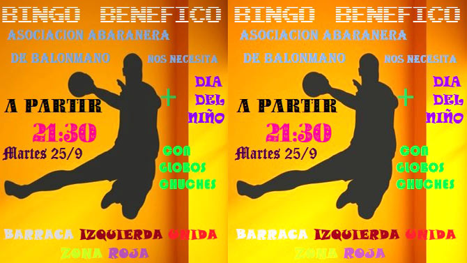 La Asociación Abaranera de Balonmano organiza esta noche un bingo benéfico con grandes regalos. Será a partir de las 21:30 horas en la zona de la barraca de Izquierda-Unida (zona roja). Habrá zona infantil, con juegos, diversión, globos y chuches para que los peques estén entretenidos mientras el resto de la familia pueda disfrutar y colaborar con el balonmano.