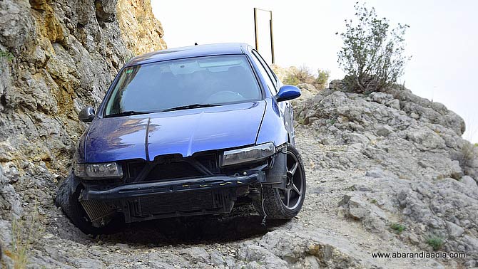Quedó encajado en un angosto camino, en la zona alta de las conocidas como 'Pozas de la Rambla de Benito', una senda por la que hasta un todoterreno tendría serias dificultades para circular -eso en la mejor parte del camino-, y por la que, finalmente, no hay salida ni posibilidad de dar marcha atrás. Así apareció este miércoles un vehículo -Seat León-, que, tras haber sido sustraído una semana antes en la pedanía murciana de Cobatillas, viajó, no se sabe porqué ni conducido por quien, hasta nuestro municipio, donde acabó incrustado contra una pared rocosa y con una rueda reventada.