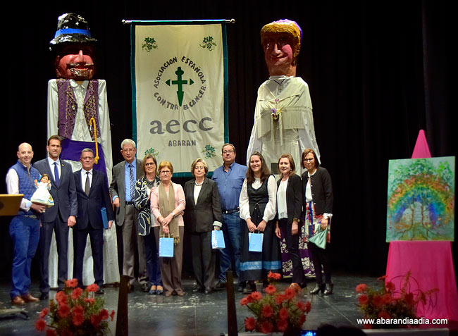 La ceremonia, conducida por Ariana Gómez, contó con la presencia del presidente regional de la AECC, Manuel Molina, además de representantes de la delegación local de Abarán, autoridades municipales y público en general, arropados por 'Eladio' y Cirila', los dos personajes más representativos de la Asociación de Gigantes y Cabezudos 'El tío Pajero', que este año apadrinas esta semana de actividades. «Es un honor para nosotros formar parte de esta larga lista de ilustres personalidades que os apadrinan. Agradecemos vuestra labor y la actitud con la que la realizáis. Y espero que sigáis con vuestros uniformes de 'costureras de los gigantes'», expresaba Jesús Saura, presidente de este colectivo abaranero, recordando la estrecha vinculación que existe entre 'los gigantes' y las integrantes del grupo 'Mucho x vivir' de la AECC, quienes llevan ya varios años 'vistiendo' a estos queridos y entrañables personajes de cartón.