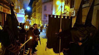 Únicamente el sordo redoble de un tambor y el crujir de la madera de las varas que descansan sobre los doloridos hombros de los anderos rompen el silencio de la noche. El reloj de la iglesia de San Pablo marca el comienzo de la procesión. La última de las campanadas de la medianoche trae consigo la oscuridad que reinará sobre el recorrido que habrá de hacer Jesús en la Cruz.