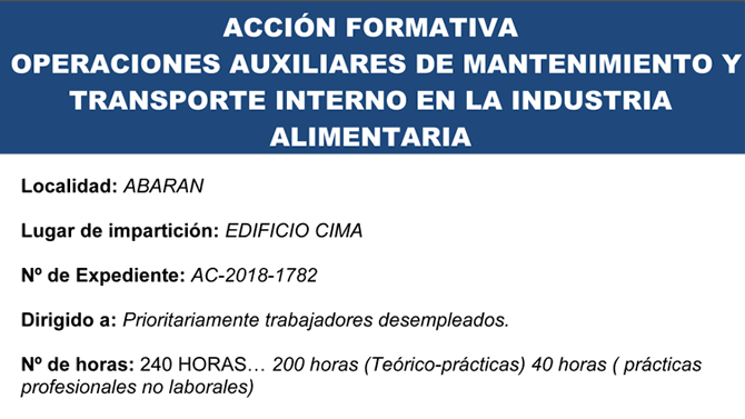 El Ayuntamiento de Abarán, en colaboración con el Servicio de Formación y Empleo (SEF), promueve una interesante acción formativa: 'Operaciones Auxiliares de Mantenimiento y Transporte Interno en la Industria Alimentaria'.