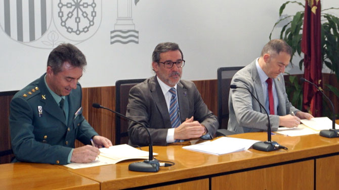 El delegado del Gobierno en Murcia, Francisco Jiménez, el alcalde de Abarán, Jesús Gómez Montiel, y el coronel de la 5ª Zona de la Guardia Civil, Jesús Arribas, han rubricado hoy en Murcia el acuerdo por el que nuestro municipio se adhiere al sistema VIOGEN, un procedimiento de colaboración y coordinación para la protección de las víctimas de violencia de género del Ministerio del Interior. Al acto han asistido también efectivos de Guardia Civil y Policía Local de Abarán, ya que ambos cuerpos de seguridad compartirán información y recursos y establecerán unos criterios básicos de colaboración y coordinación que permitirán optimizar los recursos humanos y materiales para garantizar el cumplimiento eficaz de las medidas judiciales de protección a las víctimas de violencia de género.
