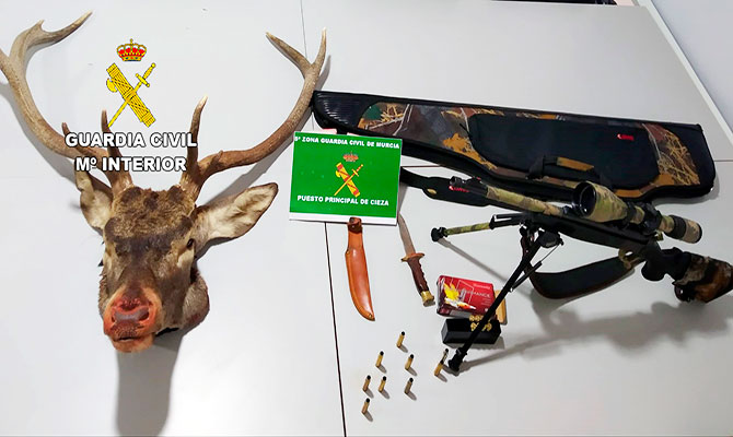 La Guardia Civil de la Región de Murcia ha desarrollado una actuación que se ha saldado con la identificación de los ocupantes de un vehículo que intentaron eludir un control policial, establecido en el Puente de Hierro del municipio de Cieza. En el interior del turismo se localizó un machete, un rifle con mira telescópica y carne de caza, y, en un paraje próximo al punto del control, una cabeza de venado.