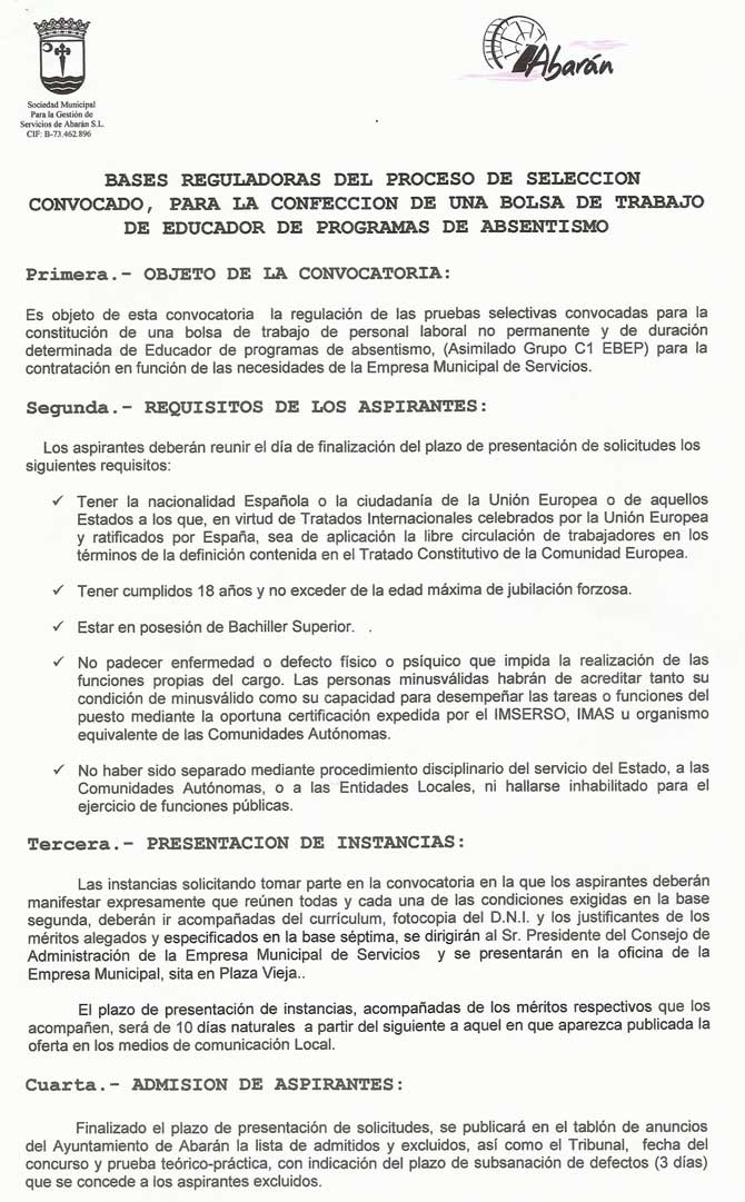 El Ayuntamiento de Abarán ha hecho pública la convocatoria del proceso de selección convocado para la confección de una bolsa de trabajo de educador de programas de absentismo escolar. Aquí pues las bases de esta convocatoria…