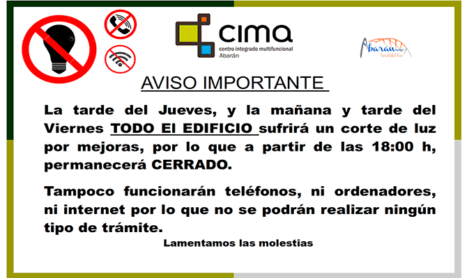 El Ayuntamiento de Abarán informa que la tarde de este jueves, además de la mañana y tarde del viernes y debido a mejoras en la red eléctrica, todo edificio CIMA sufrirá un corte de luz, por lo que, a partir de las 18:00 horas permanecerá CERRADO, y tampoco funcionarán los teléfonos, ordenadores e internet, por lo que no se podrán realizar ningún tipo de trámite.
