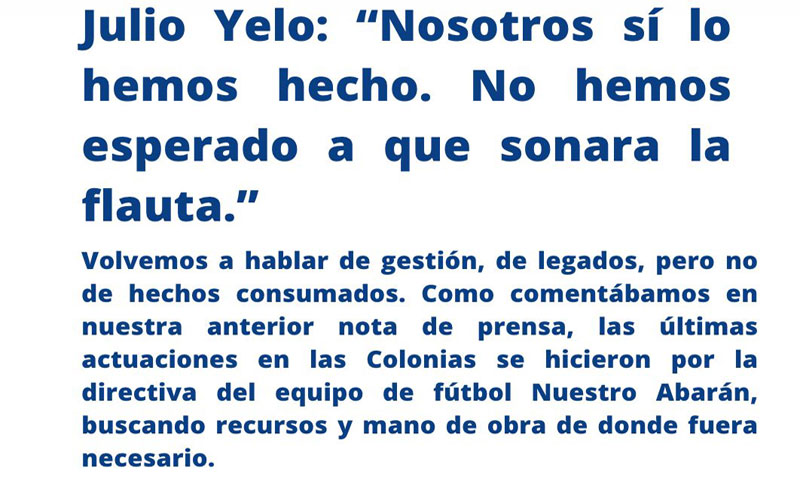 A través de una nueva nota de presa, el Partido Popular de Abarán vuelve a referirse al Campo de Futbol de 'Las Colonias' para responder a una publicación del candidato socialista y actual alcalde, una nota en la que los populares arguentan que «El único que se ha remangado para arreglar 'Las Colonias' ha sido el candidato del PP, Julio Yelo. Y no sólo eso, sino que lo lleva de forma explícita en su programa electoral: “Hacer de Las Colonias el templo del fútbol regional”».