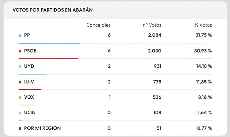 El Partido Socialista continuará también con seis ediles al sumar 2030 votos (30,93%); Unión y Desarrollo repetirá con dos representantes al obtener 931 apoyos en las urnas (14,18%); Izquierda Unida también conservará sus dos ediles (778 votos y 11,85%); y Vox continuará con un único representante contabilizando (536 votos y un 8,16%). No entran en el nuevo ayuntamiento los candidatos de UCIN Abaranera y Por mi región', con 108 y 51 votos, respectivamente.