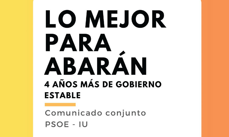 «Abarán está mejor que en 2019. Los logros cosechados, fruto del trabajo de los tres grupos que han conformado el gobierno municipal (PSOE, UyD e IU), merecen continuidad para garantizar que el proyecto iniciado se desarrolle. Los resultados obtenidos en las pasadas elecciones se interpretan como un deseo de continuidad y trasladan el mensaje que emana de las urnas y de la sociedad abaranera. Abarán necesita cuatro años más de gobierno estable y con experiencia. No tiene sentido abandonar un proyecto que ha sido positivo para Abarán. Todo lo que no sea reeditar el pacto, supone retroceder».