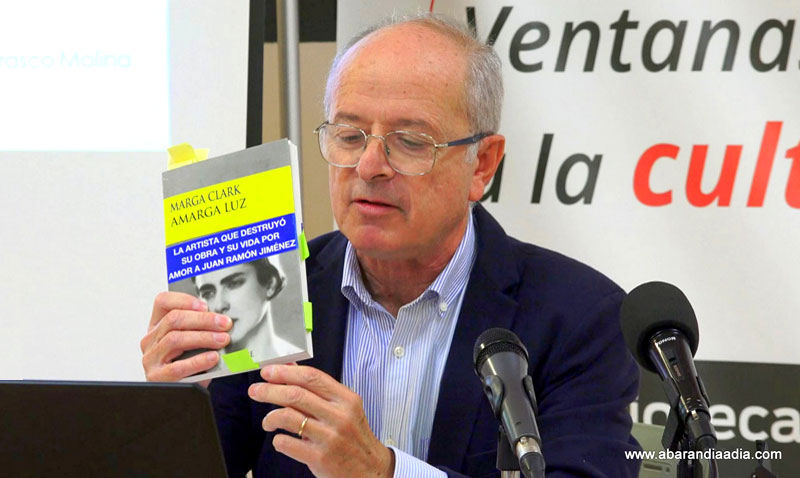 El cronista abaranero comenzaba su intervención confesando que, aun después de 40 años como profesor de Literatura, «no conocía la historia de Marga Gil y su amor no correspondido por Juan Ramón Jiménez, quien era totalmente ajeno a los sentimientos de la joven hacia él», y que cuando la descubrió (hace solo unos meses), quedó maravillado de estos hechos reales en los que ha podido profundizar a través de tres publicaciones con las que se ha documentado para poder ofrecer esta charla «de amor platónico e imposible (ya que el poeta estaba casado y tenía 27 años más que ella), que llevó a Marga a tomar la drástica decisión de acabar con su vida».