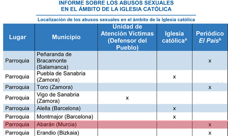 El Defensor del Pueblo, Ángel Gabilondo, hizo entrega este viernes a la presidenta de la Cámara Baja, Francina Armengol, del 'Informe sobre abusos sexuales en el ámbito de la Iglesia católica y el papel de los poderes públicos', elaborado a raíz de una encuesta de GAD3 ante la petición que le trasladó el Congreso de los Diputados hace ahora año y medio. En ese informe aparece un caso en Abarán, aunque sin especificar más datos.