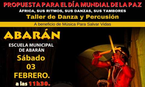 La Escuela Municipal de Música de Abarán (EMMA), junto con la ONG ‘Música para salvar vidas’ y con motivo del Día Mundial de la Paz, celebró este sábado un taller en familia bajo el título ‘Conoce la Alegría de África’, un evento que contó con la participación del percusionista y bailarín Yiga David, junto a Elisabeth Michot, presidenta de la citada ONG.