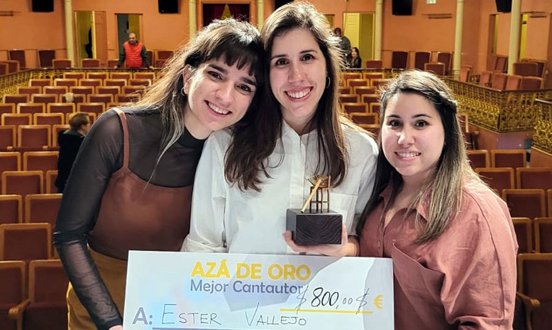 La cantautora y percusionista Ester Vallejo, natural de Zaragoza, se alzó con la 'Azá de Oro' de la tercera edición del Certamen Nacional de Cantautores y Cantautoras Azáutor 2024, consiguiendo 850 euros en metálico y su correspondiente trofeo acreditativo. El jurado otorgó también la 'Azá de Plata' a la mejor canción original al tema 'La flor del espino', compuesta e interpretada por el toledano Lorenzo García, que recibió 250 euros y trofeo. Completaron el cuarteto de finalistas en este certamen de canción de autor Beatriz González, de Málaga (que ya participó en la edición anterior), y Arisa Vedra, de Alicante.