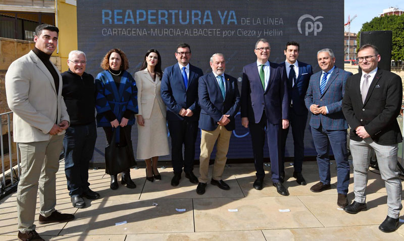 Durante el acto, celebrado en Los Molinos del Río, se ha exigido «la reapertura inmediata de la línea Cartagena Murcia Albacete por parte del Gobierno de España, tal y como se comprometió a hacer antes de 2024; una solución definitiva al paso del ferrocarril por Alcantarilla y Javalí Nuevo; un servicio ferroviario de calidad que vertebre todos los municipios del eje con al menos 10 circulaciones diarias así como que se inicien los trámites para convertir la línea Cartagena-Murcia-Albacete por Cieza y Hellín en una vía de altas prestaciones, electrificada y de alta velocidad de acuerdo con los requisitos de la Extended Core de La Red Transeuropea de Transportes, tras la rúbrica de un Manifiesto por la Línea Directa del Sureste», han destacado los populares en una nota de prensa a la terminación del acto recordando que Cartagena, Murcia y Albacete quedaron unidas por ferrocarril en el año 1865, convirtiéndose, durante más de un siglo y medio, en una infraestructura fundamental para el desarrollo y crecimiento económico, turístico y social de estos territorios y otros municipios aledaños.