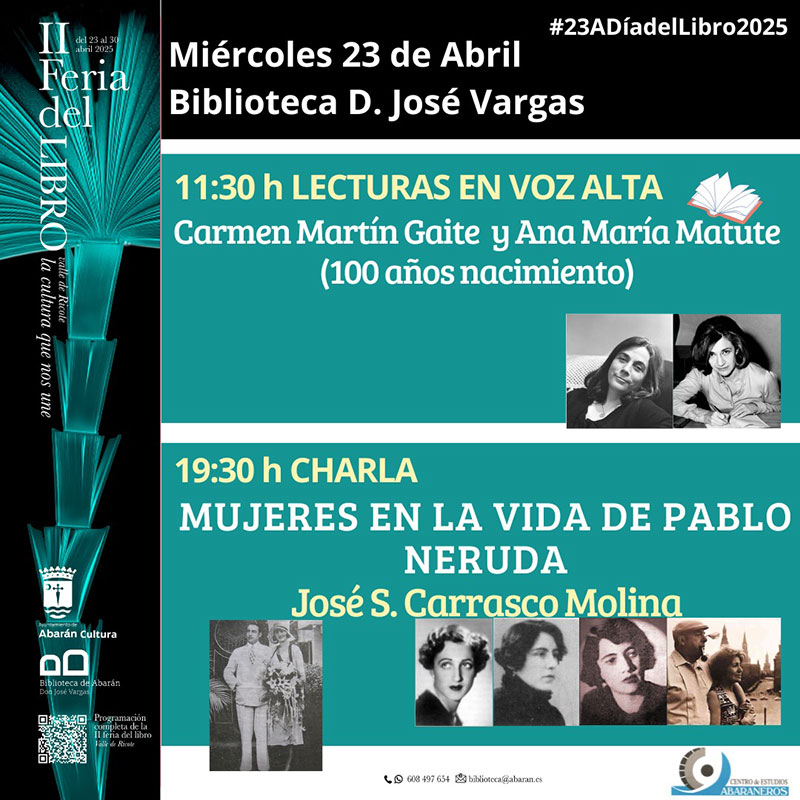 - Miércoles 23: Charla: "Las mujeres en la vida de Pablo Neruda" por José S. Carrasco Molina. Biblioteca D. José Vargas Gómez, 19:30h.