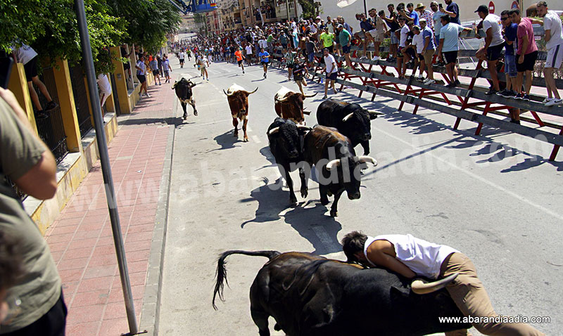 El tercer encierro de la Feria Taurina de Blanca no estuvo exento de emociones fuertes, con distintos incidentes que, afortunadamente, no pasaron a mayores. El momento más impactante se vivió cuando un joven, vecino de Cieza, era arrollado por uno de los astados, sufriendo una espectacular voltereta y una aparatosa caída, quedando tendido en el suelo, inerte, durante unos angustiosos segundos.