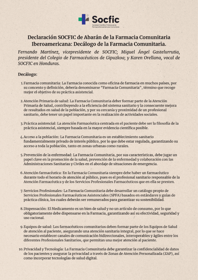 Uno de los momentos culminantes de estas jornadas ha sido la presentación de la Declaración SOCFIC sobre la Farmacia Comunitaria, un documento que lleva el nombre de nuestro municipio. Jesús Carlos Gómez confiesa el profundo significado que esto tiene para él como abaranero: «Cuando un abaranero ya no esté aquí presente, lo que no pasará es esta declaración con el nombre de Abarán a nivel de todos los pueblos, ciudades y estados de toda Iberoamérica. Cuando se refieran a la farmacia comunitaria tendrán que decir el nombre de este pueblo que llevo en mi corazón: Abarán, mi pueblo».