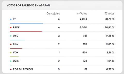 Según los datos hechos públicos por la Comunidad Autónoma de la Región de Murcia, en Abarán, con los datos recogidos al filo de las 18:00 horas, solo dos horas antes de que cerrasen los colegios electorales, el índice de participación se situaba en un 55,79%, 3,72 puntos por encima de la misma convocatoria electoral de 2019.