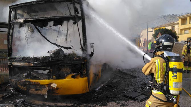 Bomberos del Consorcio de Extinción de Incendios y salvamento de la Región de Murcia, adscritos al Parque Comarcal de Cieza, se tuvieron que emplear a fondo este miércoles por la tarde para extinguir el incendio de un autobús que, por causas que se desconocen, comenzó a arder en el municipio de Ricote.