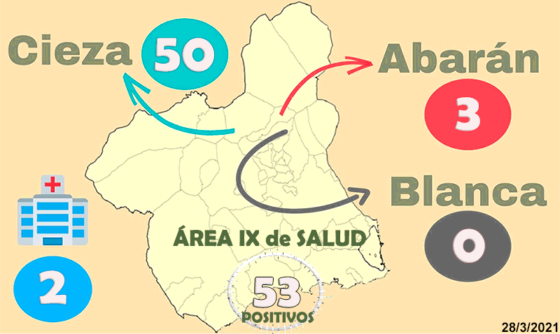 Solo dos pacientes, vecinos de Cieza y de la pedanía abaranera de Hoya del Campo, permanecen ingresados a fecha de hoy, 22 de marzo, en la planta covid del Hospital de Cieza en un lunes en el que se han conocido únicamente dos nuevos contagios por la Covid-19, ambos en el municipio de Cieza donde actualmente hay 60 positivos, que, unidos a los 11 con los que cuenta Abarán, suman los 71 existentes en el Área IX de Salud.